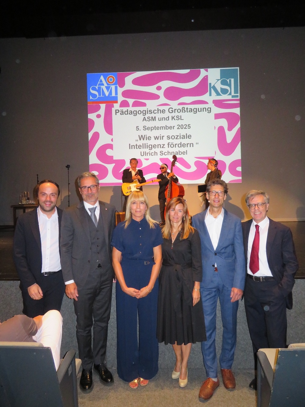 Landesrat Philipp Achammer (ganz links) und Südtirols Landeshauptmann Arno Kompatscher (zweiter von links) gerieten auf der Pädagogischen Großtagung der Südtiroler Lehrerverbände ziemlich unter Beschuss.